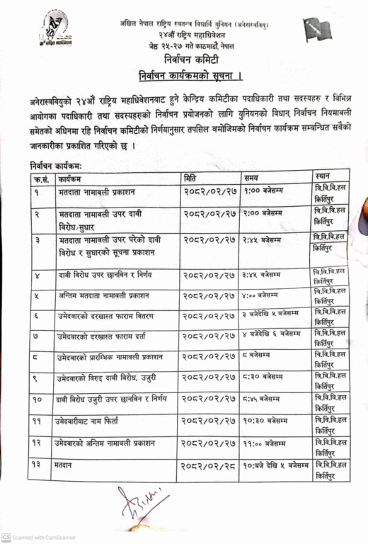 निर्वाचन समितिका अनुसार आज ३ देखि ५ बजेसम्म उम्मेदवारी फारम वितरण, ४ देखि ६ बजेसम्म उम्मेदवारी दर्ता र राति ८ बजेसम्म प्रारम्भिक नामावली प्रकाशन हुनेछ । मतदान भने भोलि बिहान १० देखि ५ बजेसम्म तय भएको छ ।