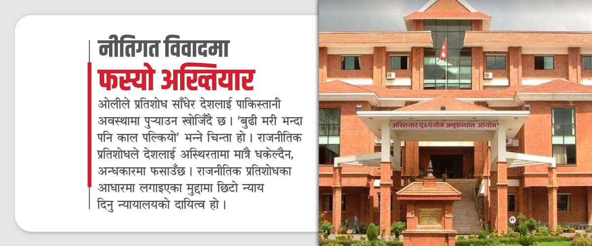 प्रतिपक्ष दलहरू मात्रै होइन, प्रमुख सत्तारुढ दल नेपाली कांग्रेसका सभापति शेरबहादुर देउवाले नेपालमाथि लागेको मुद्दामा आश्चर्य प्रकट गरेबाट पनि यो मुद्दा राजनीतिक प्रतिशोधमै दर्ता गरिएको ठहर्छ । राजनीतिक प्रतिशोधमा संवैधानिक निकाय अख्तियारसमेत प्रयोग भएको गम्भीर आरोप लागेका कारण अब यसको छिटो न्यायिक निरूपण हुनुपर्छ । सत्ताको प्रयोग व्यक्तिगत तथा दलगत प्रतिशोधको अस्त्रका रूपमा हुन थालेपछि अख्तियारको निष्पक्षतामाथि गम्भीर प्रश्न खडा भएको छ ।