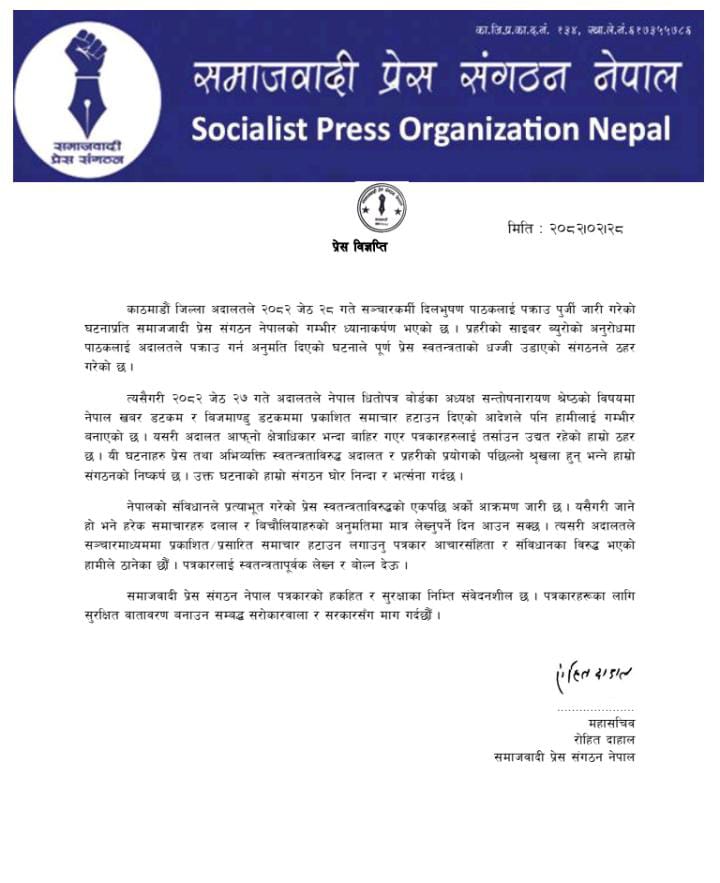 काठमाडौं । नेकपा (एकीकृत समाजवादी) निकट समाजवादी प्रेस संगठनले पत्रकार दिलभूषण पाठकमाथि पक्राउ पुर्जी जारी भएकोप्रति भर्त्सना गरेको छ ।