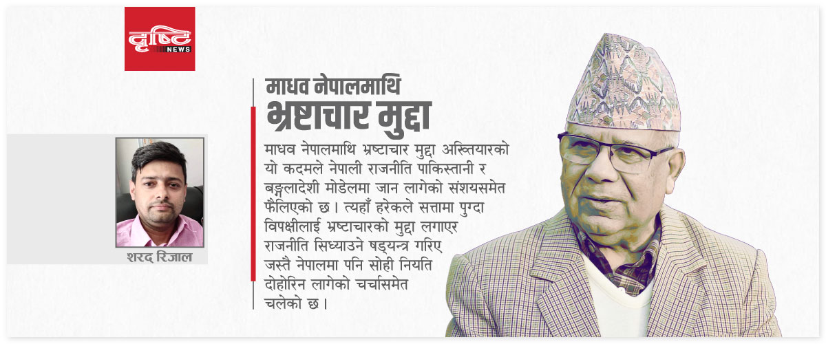 नेपालको राजनीतिक इतिहासमै पहिलो पटक पूर्वप्रधानमन्त्री र मन्त्रिपरिषद्को निर्णयमाथि अख्तियारले भ्रष्टाचारको आरोप लगाउँदै पूर्वप्रधानमन्त्री माधवकुमार नेपालविरुद्ध मुद्दा दायर गरेको छ । पूर्वप्रधानमन्त्री एवं नेकपा(एकीकृत समाजवादी)का अध्यक्ष समेत रहेका नेपालमाथि पतञ्जलीको हदबन्दी भन्दा बढी जग्गा खरिद बिक्रीमा अनियमितता गरिएको भन्दै अख्तियारले नेपालसहित ९३ जनाविरुद्ध विशेष अदालतमा मुद्दा दायर गरेपछि नेपाली राजनीति निकै तरङ्गित भएको छ ।