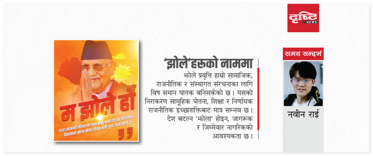 ‘झोले’ बन्ने हो भने विचारको बोझ बिर्सनुपर्छ । विवेक, आत्मसम्मान र आलोचनाको साहस झोलाभित्र अटाउँदैन । त्यसैले अब समय आएको छ– ‘झोले’ बन्ने होड छाडेर चेतनाको काँधमा राष्ट्रिय जिम्मेवारीको झन्डा फहराउने । राजनीतिक नेतृत्व र नागरिक दुवैले आत्ममूल्यांकन गर्न सिके मात्र देशको दिशा बदलिन्छ ।