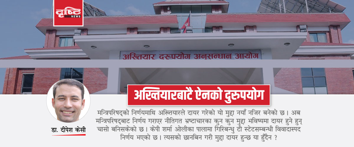 क्याबिनेटबाट निर्णय गराएर नीतिगत भ्रष्टाचार हुन थालेपछि अख्तियारलाई छानबिनको अधिकार थप्ने गरी ऐन परिवर्तनको विषय नउठेको होइन । तर, जसले विषय उठाए उनीहरू नै अहिले आएर पछि हटेका छन् । अख्तियारलाई मन्त्रिपरिषद्को निर्णयको छानबिन गर्ने अधिकार दिएमा आफूहरू पनि जेल जाने देखेपछि पूर्वप्रधानमन्त्री र शक्तिशाली मन्त्रीहरू पछि हटेका हुन् । भ्रष्टाचार गरेको सम्पत्ति देश विदेशमा लुकाएर जोगिएकाहरू नीतिगत भ्रष्टाचार समेत अख्तियारको छानबिनको दायरामा आउने नियम बनेमा जेल जाने देखेर अहिलेकै अधिकारलाई यथावत् राख्ने गरी चुप बसे । तर, जनतासामु नीतिगत भ्रष्टाचार छरपस्ट छ ।