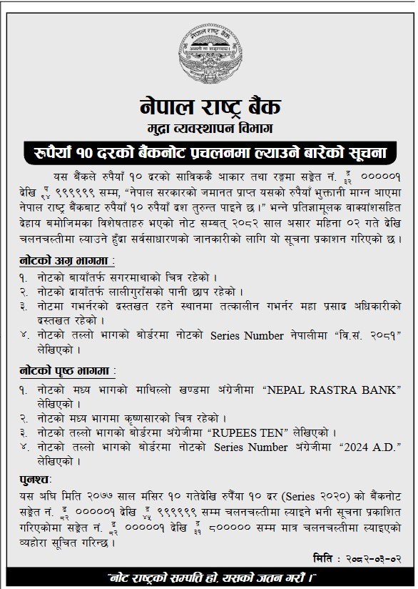 नेपाल राष्ट्र बैंक मुद्रा व्यवस्थापन विभागले आज सूचना जारी गर्दै साविककै आकार तथा रंगमा १० रुपैयाँ दरको नयाँ नोट आजदेखि प्रचलनमा ल्याइएको जानकारी दिएको हो ।