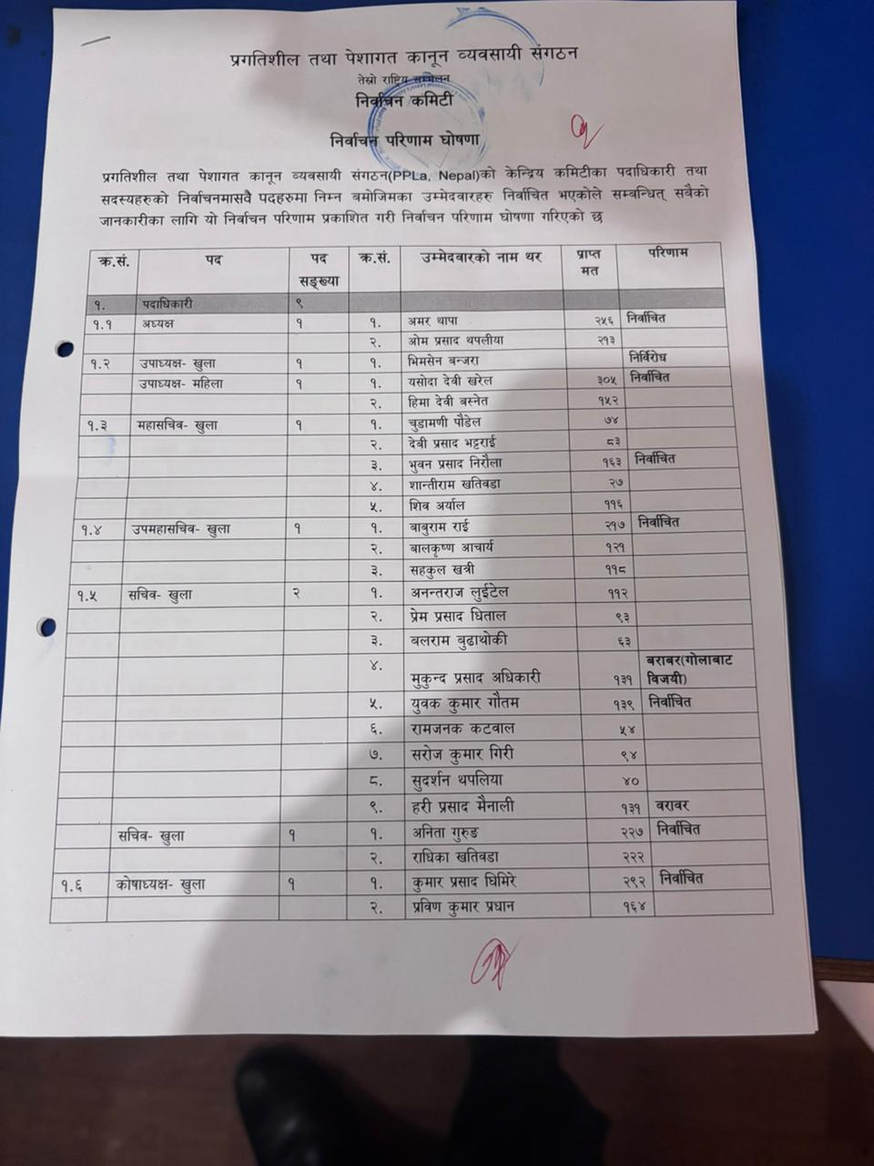 प्रतिद्वन्द्वी संस्थापनका उम्मेदवार ओमप्रसाद थपलियालाई ४३ मतले पछि पार्दै वरिष्ठ अधिवक्ता थापा विजयी भएका हुन् । थापाले २५६ मत ल्याउँदा थपलियाले २१३ मत पाए ।