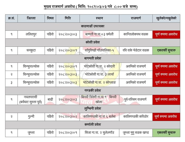 त्यसैगरी, गुल्मीको कालीगण्डकी गाउँपालिका–६ बर्लबामा पहिरो खस्दा कालीगण्डकी करिडोर पूर्ण रूपमा अवरुद्ध भएको छ भने जुम्लाको सिंजामा पहिरो खस्दा बन्द गराएको जुम्ला–मुगु सडक र धनकुटाको साँगुरीगढी गाउँपालिका–५ को रवि–राके–भेडेटार सडक एकतर्फी खुलाइएको छ । अवरुद्ध रहेका सडक खुलाउने प्रयास जारी रहेको प्रहरीका प्रवक्ता प्रहरी नायब महानिरीक्षक विनोद घिमिरेले जानकारी दिए ।