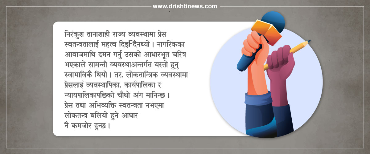 निरंकुश तानाशाही राज्य व्यवस्थामा मात्र प्रेस स्वतन्त्रतालाई महत्व दिइँदैनथ्यो । नागरिक स्वतन्त्रता अर्थात् नागरिकका आवाजमाथि दमन गर्नु नै उसको आधारभूत चरित्र भएकाले सामन्ती व्यवस्थाअन्तर्गत यस्तो हुनु स्वाभाविकै हुन्थ्यो । लोकतान्त्रिक व्यवस्थामा भने ‘प्रेस स्वतन्त्रता’ को महत्व छ । लोकतान्त्रिक व्यवस्थामा भने प्रेसलाई व्यवस्थापिका, कार्यपालिका र न्यायपालिकापछिको चौथो अङ्ग मानिन्छ । प्रेस तथा अभिव्यक्ति स्वतन्त्रता नभएमा लोकतन्त्र बलियो हुने आधार नै कमजोर हुन्छ । यो विषयमा राज्यको शासन व्यवस्थामा पुगेकाहरुले सधै आफ्नो अनुकुल प्रयोग गर्न खोजेको पाउछौँ ।