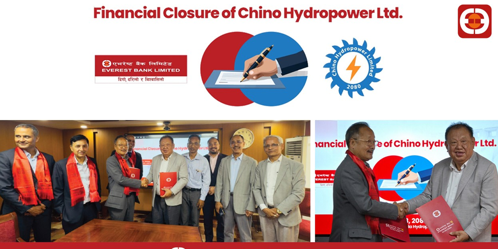 काठमाडौं । एभरेष्ट बैंक र चिनो हाइड्रोपावर लिमिटेडबीच चिनो खोलामा ७.८३ मेगावाट क्षमताको जलविद्युत आयोजना निर्माण गर्न १ अर्ब ३६ करोड वित्तीय व्यवस्थापन गर्न सहमति भएको छ ।