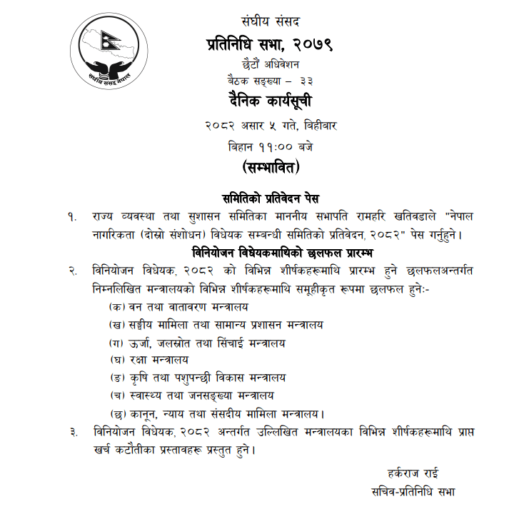 यस्तै, राज्य व्यवस्था तथा सुशासन समितिका सभापति रामहरि खतिवडाले ‘नेपाल नागरिकता (दोस्रो संशोधन) विधेयकसम्बन्धी समितिको प्रतिवेदन, २०८२’ पेस गर्ने कार्यसूची छ ।