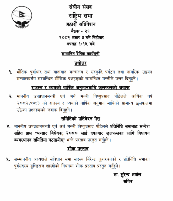 त्यसैगरी, उपप्रधान एवं अर्थमन्त्री विष्णुप्रसाद पौडेलले आर्थिक वर्ष २०८२/८३ को राजस्व र व्ययको वार्षिक अनुमान माथिको सामान्य छलफलमा उठेका प्रश्नहरूको जवाफ दिने सम्भावित कार्यसूची छ ।