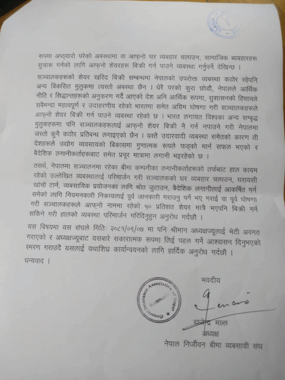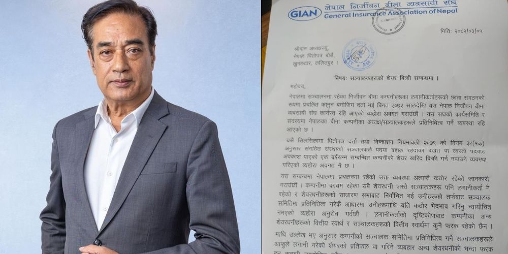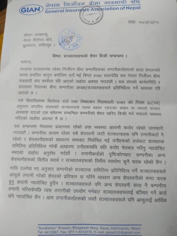 कठमाडौं । सञ्चालकहरूको स्वामित्वमा भएको सेयर कम्पनीमा राजीनामा पछि पनि १ वर्षसम्म बिक्री गर्न नपाउने व्यवस्थाप्रति नेपाल निर्जीवन बीमा व्यवसायी सङ्घले आपत्ति जनाएको छ ।