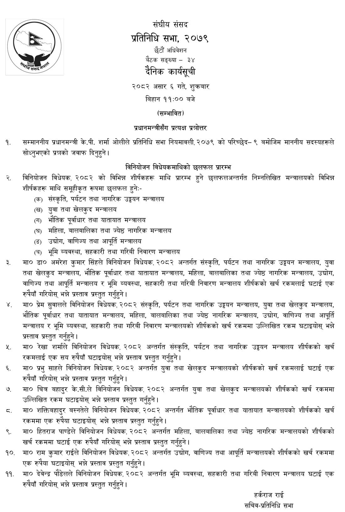 त्यस्तै संस्कृति, पर्यटन तथा नागरिक उड्डयन, युवा तथा खेलकुद, भौतिक पूर्वाधार तथा यातायात, महिला, बालबालिका तथा ज्येष्ठ नागरिक, उद्योग वाणिज्य तथा आपूर्ति र भूमि व्यवस्था, सहकारी तथा गरिबी निवारण मन्त्रालयको विनियोजनमाथि छलफल हुने कार्यसूची तय भएको संसद् सचिवालयले जनाएको छ ।