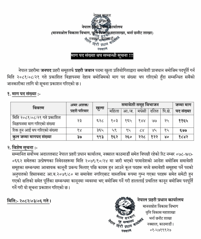 प्रहरीले आज सूचना जारी गर्दै सर्वोच्च अदालतको आदेश कार्यान्वयन गर्नका लागि पहिले माग गरिएको १ हजार १६५ पदमा थप ६७७ पद थप गर्ने निर्णय गरिएको जानकारी दिएको हो ।