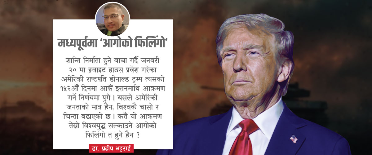 शान्ति निर्माता हुने वाचा गर्दै जनवरी २० मा ह्वाइट हाउस प्रवेश गरेका अमेरिकी राष्ट्रपति डोनल्ड ट्रम्प त्यसको १५२औं दिनमा आफैं इरानमाथि आक्रमण गर्ने निर्णयमा पुगे । यसले अमेरिकी जनताको मात्र हैन, सारा विश्ववकै चासो र चिन्ता बढाएको छ । यतिबेला उनीहरूको दिमाखमा एउटै मोटो प्रश्न छ, कतै यो आक्रमण कतै तेस्रो विश्वयुद्ध सल्काउने आगोको फिलिङ्गो त हुने हैन ?