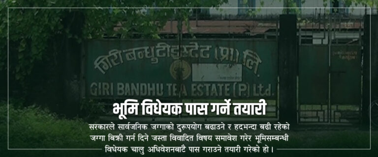 झापाको गिरीबन्धु टी–इस्टेटसहितका घरजग्गा कारोबारीको स्वार्थअनुसार २०७६ सालमै तत्कालीन सरकारले भूमिसम्बन्धी ऐनको आठौँ संशोधनमार्फत त्यस्ता कम्पनीलाई फाइदा हुने प्रावधान गरिसकेको थियो । सोही ऐनअनुसार हालै नियमसमेत बनाएर मन्त्रालयले वैधता दिने तयारीमा लागेको छ ।