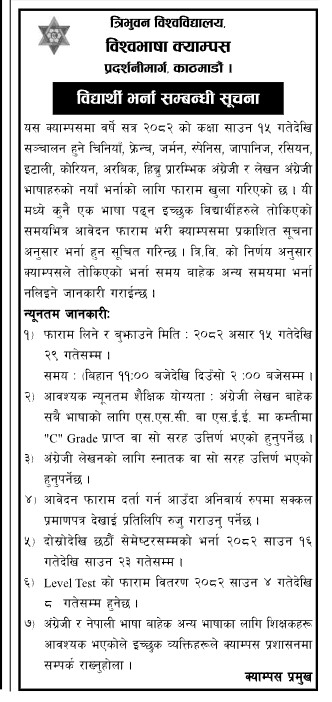 काठमाडौं । त्रिभुवन विश्वविद्यालय अन्तर्गतको विश्वभाषा क्याम्पसले विभिन्न भाषामा अध्ययन गर्न चाहने विद्यार्थीका लागि नयाँ भर्ना खुला गरेको छ ।