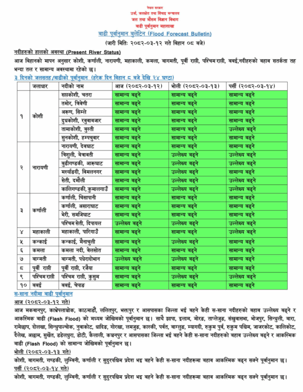 साथै झापा, इलाम, मोरङ, ताप्लेजुङ, संखुवासभा, भोजपुर, सिन्धुली, बारा, रामेछाप, दोलखा, सिन्धुपाल्चोक, नुवाकोट, धादिङ, गोरखा, लमजुङ, कास्की, पर्वत, बागलुङ, म्यागदी, रुकुमपूर्व, रुकुमपश्चिम, जाजरकोट, कालिकोट, दैलेख, अछाम, सुर्खेत, डडेलधुरा, डोटी, कैलाली, कञ्चनपुर र आसपासका जिल्ला भई बहने केही ससाना नदीको बहाब उल्लेख्य बढ्ने र आकस्मिक बाढीको सामान्य जोखिमको देखिएकाले ती जिल्लाका नदीका तटीय क्षेत्रमा पनि सामान्य सतर्कता अपनाउन भनिएको छ ।