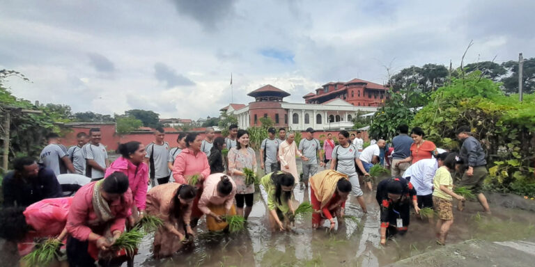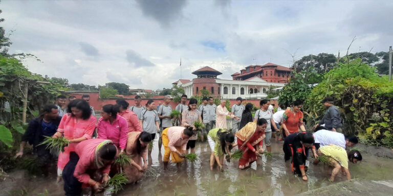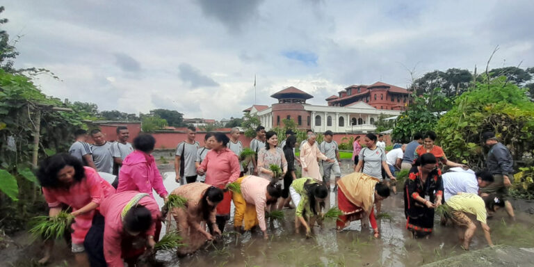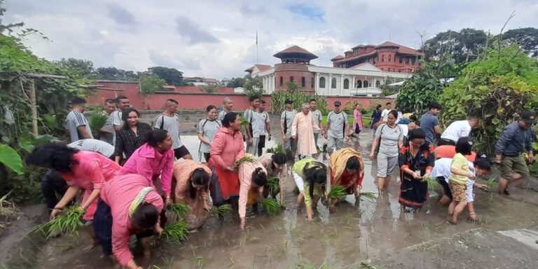 काठमाडौं । धान दिवसका उपलक्ष्यमा राष्ट्रपति भवनमा रोपाइँ गरिएको छ । राष्ट्रपति कार्यालयद्वारा आयोजित रोपाइँमा राष्ट्रपति रामचन्द्र पौडेल, प्रथम महिला सविता पौडेल लगायत सहभागी भएका थिए ।