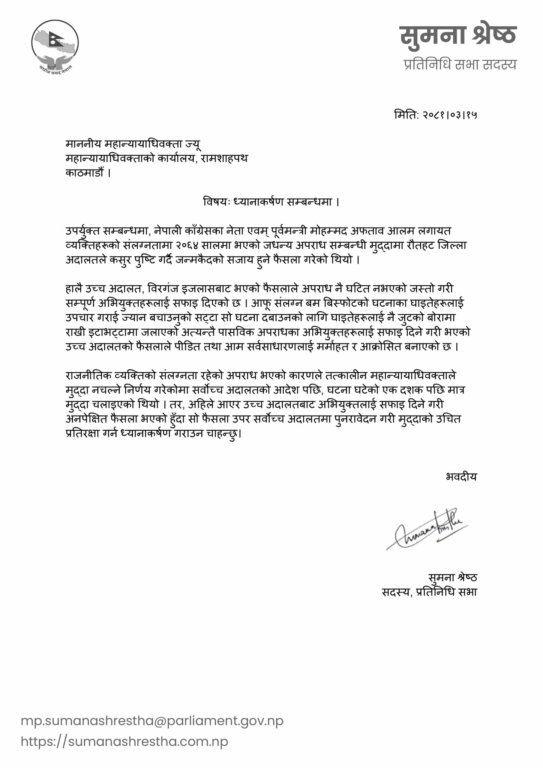 सांसद श्रेष्ठले पत्रमा यस्तो क्रूर अपराधका अभियुक्तलाई सफाइ दिने फैसलाले पीडित परिवार र आम जनतालाई मर्माहत र आक्रोशित बनाएको उल्लेख गरेकी छिन् । उनले महान्यायाधिवक्ता कार्यालयलाई यो मुद्दामा कडा कदम चालेर न्याय सुनिश्चित गर्न आग्रह गरेकी छिन् । यो घटनाले न्यायिक प्रक्रिया र राजनीतिक प्रभावबारे फेरि एकपटक गम्भीर प्रश्न उठाएको छ ।
