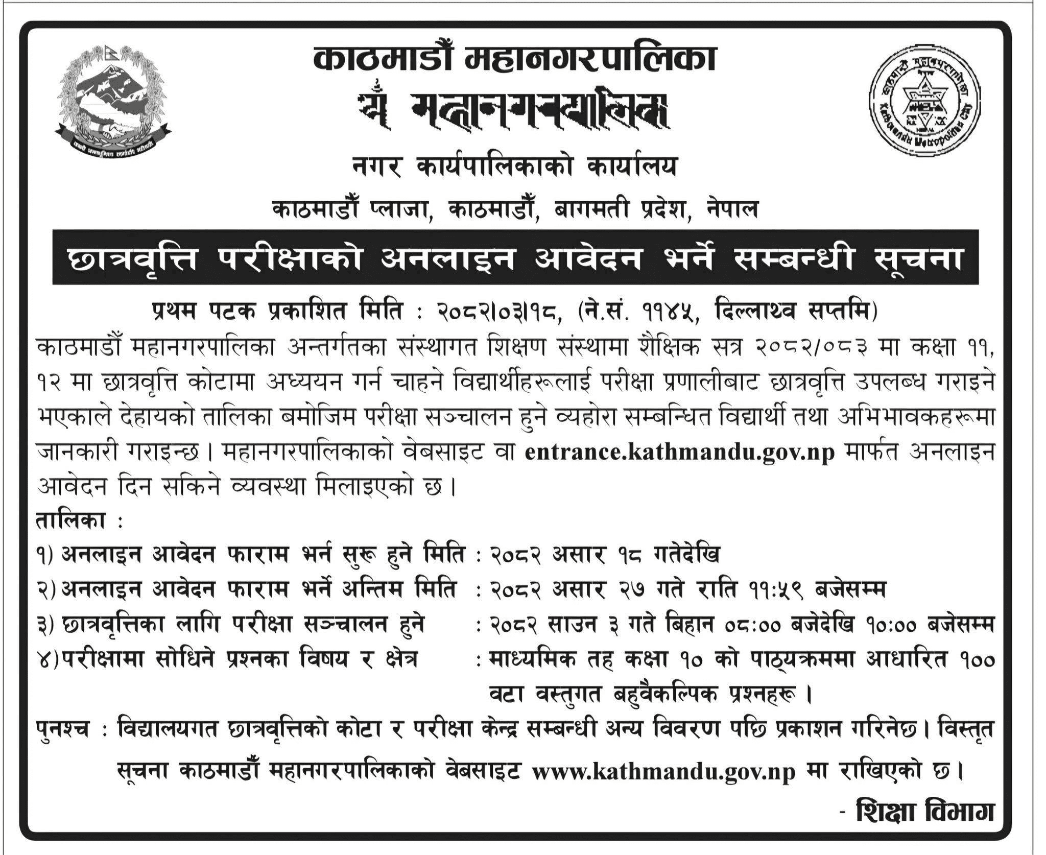 सूचनामा उल्लेख गरिएअनुसार, विद्यालयगत छात्रवृत्तिको कोटा र परीक्षा केन्द्र सम्बन्धी विस्तृत विवरण पछि प्रकाशन गरिनेछ । थप जानकारीका लागि काठमाडौं महानगरपालिकाको आधिकारिक वेबसाइट www.kathmandu.gov.np मा हेर्न सकिने सूचनामा उल्लेख छ ।