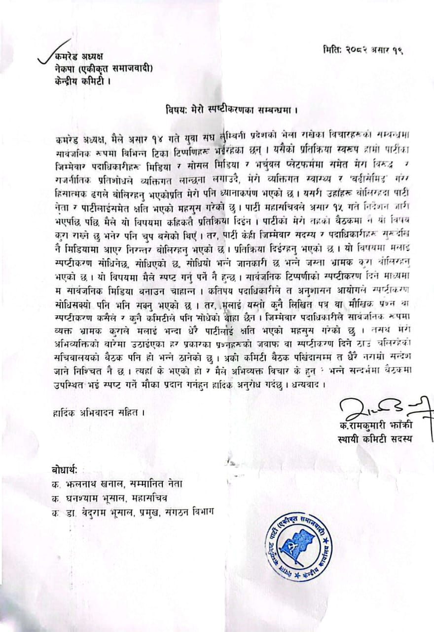 उनले अध्यक्ष माधव नेपाललाई सम्बोधन गरेर लेखेको पत्रमा आफुले बोलेका बिषयमा भने बैठकमा आफ्ना कुरा राख्ने उल्लेख गरेकी छन् । स्थायी कमिटी बैठक तत्काल बस्ने अवस्था नरहेकाले जारी सचिवालय बैठकमा उपस्थीत भइ स्पष्ट पार्ने मौका प्रदान गर्न आग्रह गर्दै नेतृ झाँक्रीले अध्यक्षका नाममा पत्र दर्ता गराएकी हुन् । झाँक्रीले असार १४ गते युवा संघ लुम्बिनी प्रदेशको भेलामा समय अगावै पार्टी नेतृत्व परिवर्तन गर्नुपर्ने अभिव्यक्ति दिएकी थिइन् ।
