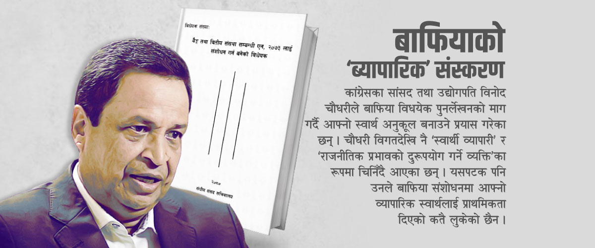 कांग्रेसका सांसद तथा उद्योगपति विनोद चौधरीले बाफिया विधयेक पुनर्लेखनको माग गर्दै आफ्नो स्वार्थ अनुकूल बनाउने प्रयास गरेका छन् । यो कदमले व्यापारीहरूले कसरी राजनीतिक पहुँचको प्रयोग गरेर नीतिमा प्रभाव पार्छन् भन्ने उदाहरण प्रस्तुत गरेको छ ।
