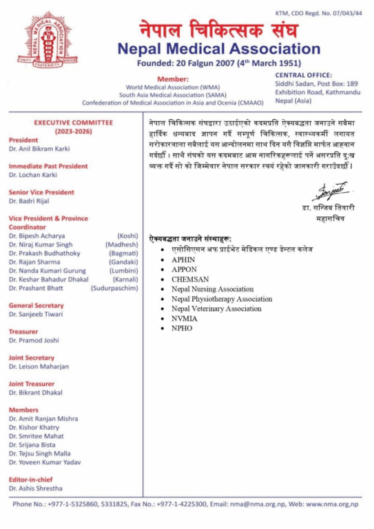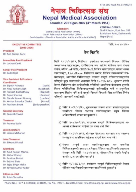 यसैगरी, २४ गते संघले चिकित्सकहरूको हस्ताक्षर र नेपाल मेडिकल काउन्सिलको प्रमाणपत्र संकलन गरी काउन्सिलमा बुझाउने भएको छ । उपभोक्ता अदालतले उपचारमा लापरबाही भएको भन्दै तीनवटा अस्पताल र चिकित्सकविरुद्ध जरिवाना र कारबाहीको फैसला गरेपछि संघले विरोध जनाउँदै आएको छ ।