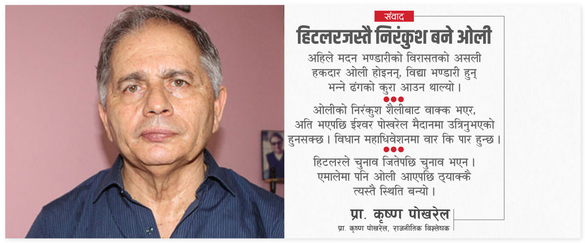 ओलीको निरंकुश शैलीबाट वाक्क भएर, अति भएपछि ईश्वर पोखरेल मैदानमा उत्रिनुभएको हुनसक्छ । वरिष्ठ उपाध्यक्ष नै मैदानमा उत्रिएपछि एमालेमा राम्रै हलचल ल्याएको छ । उहाँले विधिको कुरा उठाउनुभएको छ, त्यो राम्रो पक्ष हो । आफू हटेपनि विधि स्थापित होस् भन्ने उहाँको कुरालाई हल्का रुपमा लिन मिल्दैन । तिकडमवाजीमा ओलीलाई अरूले भेट्न सक्दैनन् । तर, राजनीतिमा सबै कुरा तिकडमकै भरमा मात्रै चल्दैन ।