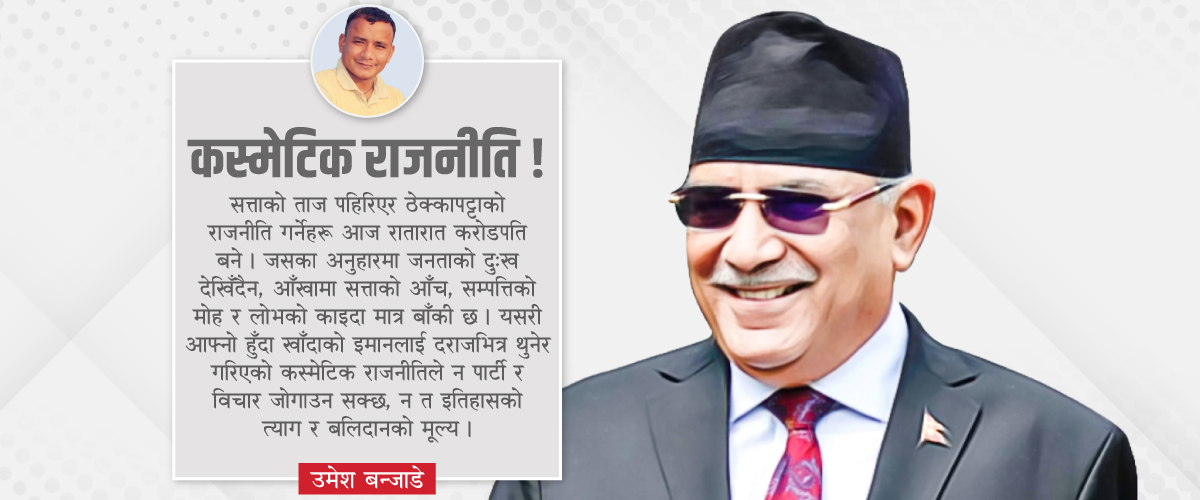सत्ताको ताज पहिरिएर ठेक्कापट्टाको राजनीति गर्नेहरू आज रातारात करोडपति बने । जसका अनुहारमा जनताको दुःख देखिँदैन, आँखामा सत्ताको आँच, सम्पत्तिको मोह र लोभको काइदा मात्र बाँकी छ । यसरी आफ्नो हुँदा खाँदाको इमानलाई दराजभित्र थुनेर गरिएको कस्मेटिक राजनीतिले न पार्टी र विचार जोगाउन सक्छ, न त इतिहासको त्याग र बलिदानको मूल्य ।