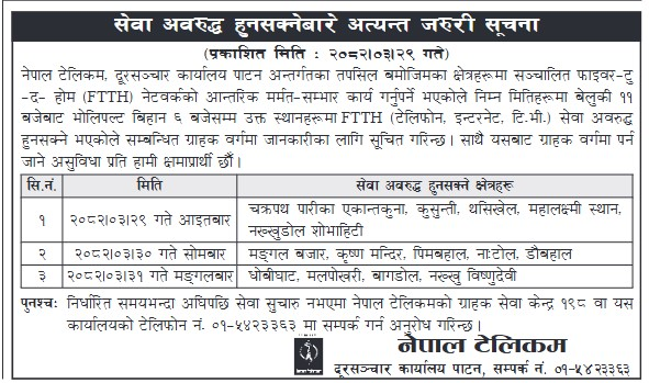 आइतबार राति ११ बजेदेखि भोलि बिहान ६ बजेसम्म पाटन कार्यालय अन्तर्गत चक्रपथ पारिको एकान्तकुना, कुसुन्ती, महालक्ष्मीस्थान, नख्खुडोल शोभाहिटी क्षेत्रमा टेलिफोन, इन्टरनेट र टिभी सेवा अवरुद्ध हुने सूचनामाा उल्लेख छ ।
