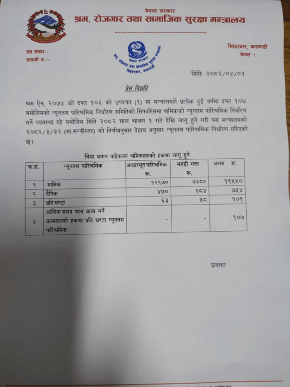 काठमाडौं । सरकारले श्रमिकको न्यूनतम पारिश्रमिक बढाएको छ । श्रम, रोजगार तथा सामाजिक सुरक्षा मन्त्रालयले १ साउनदेखि लागु हुने गरी न्यूनतम पारिश्रमिक निर्धारण गरेको हो ।