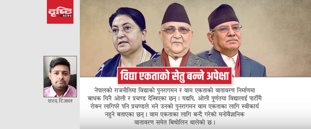 ओलीको व्यक्तिवादी हैकम र प्रचण्डको अस्थिर चरित्र नै वाम एकताका लागि बाधक भएको समयक्रमले पुष्टि गरिसकेको छ । यी दुवैको नेतृत्व रहिरहे वामपन्थी आन्दोलनले थप क्षति व्यहोर्ने निश्चित छ । यसरी ओली–प्रचण्ड प्रवृत्ति नेपालको वामपन्थी आन्दोलन मजबुद र एकताबद्ध बनाउने होइन, निषेध र विभाजनका कारक हुन् । यी दुवै नेताहरू आफ्नो एकल नेतृत्व मोहले वाम आन्दोलन थप कमजोर बनाएरै भए पनि सानो गुटमै रमाउने चेष्टा गरेका छन् । यही बुझेर दुवै पार्टीका नेता कार्यकताहरुले विद्याको पुनरागमनलाई विकल्पका रूपमा लिँदै वाम सहकार्य र एकताको सेतु बन्ने अपेक्षा गरेका हुन् ।