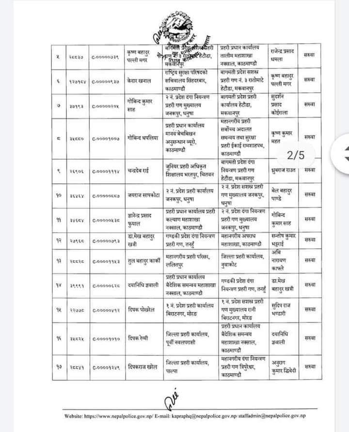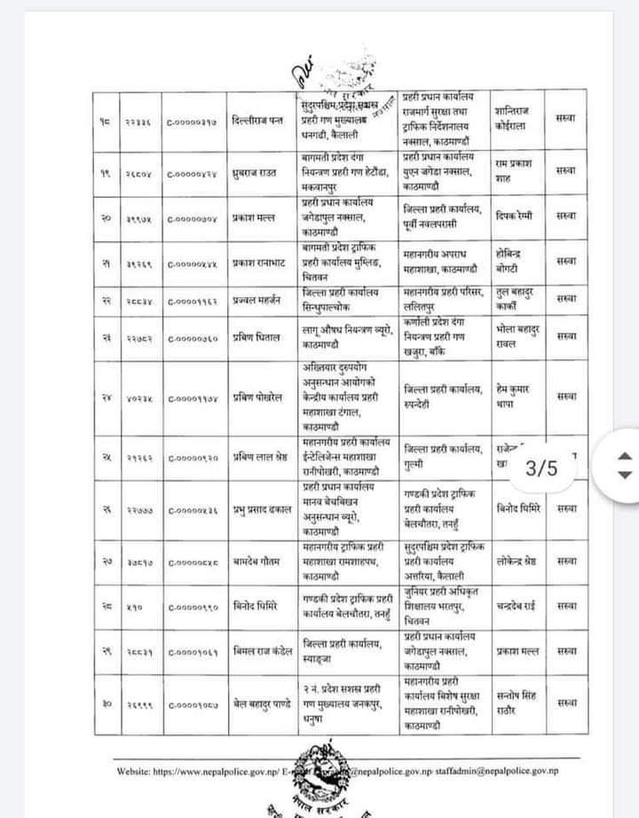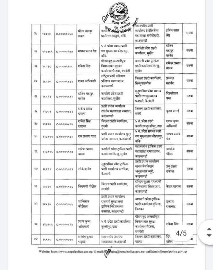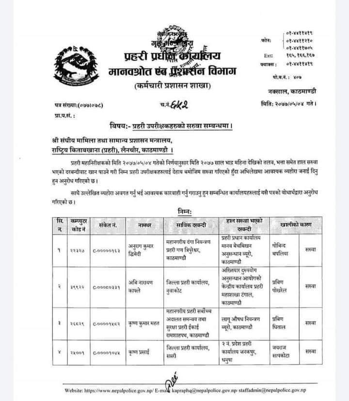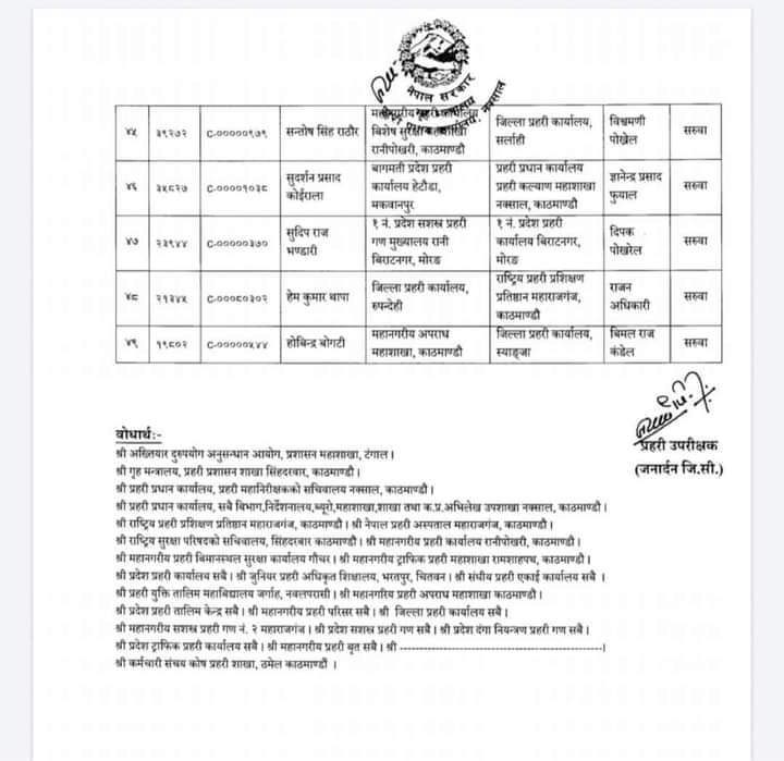 जिल्ला प्रहरी कार्यालय रुपन्देहीमा अख्तियारमा कार्यरत एसपी प्रबीण पोखरेललाई पठाइएको छ । त्यस्तै नुवाकोटमा तुलबहादुर कार्कीको सरुवा भएको छ ।