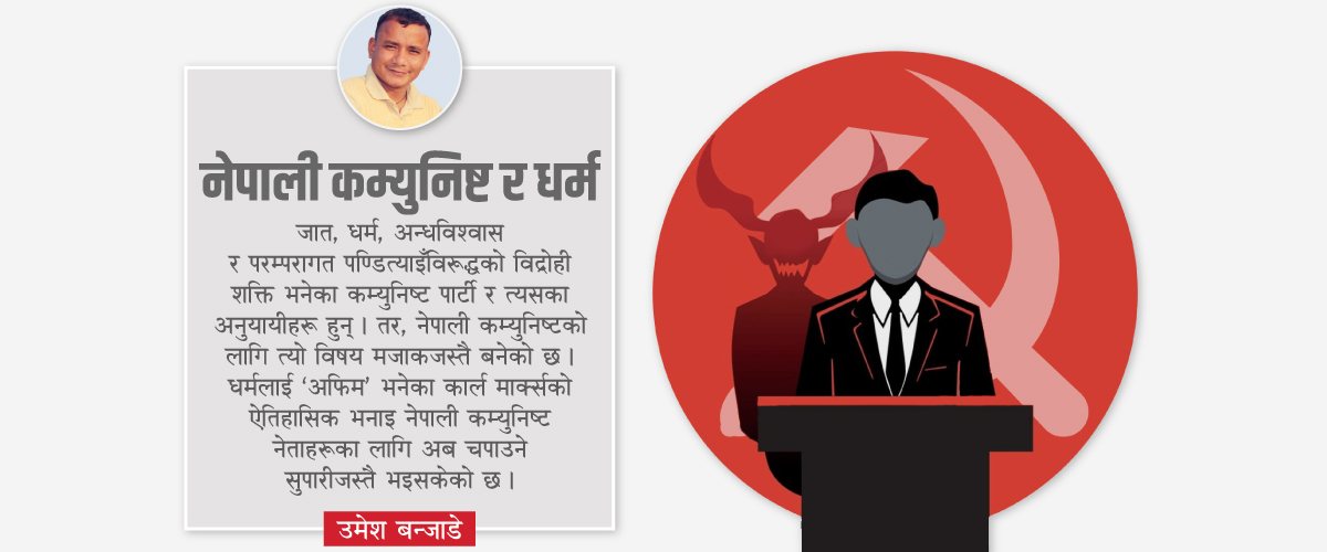 यद्यपि, हाम्रो नेपालमा रहेका कम्युनिष्ट पार्टी र नेताहरूको लागि त्यो विषय एउटा मजाक जस्तै बनेको छ । धर्मलाई ‘अफिम’ भन्ने विश्व कम्युनिष्ट आन्दोलनका प्रतिपादक कार्लमाक्र्सको भनाइको सार बुझ्नुभन्दा पहिले, त्यो उखान नेपाली कम्युनिष्ट नेताहरूको चपाउने सुपारी जस्तै बनेको छ ।