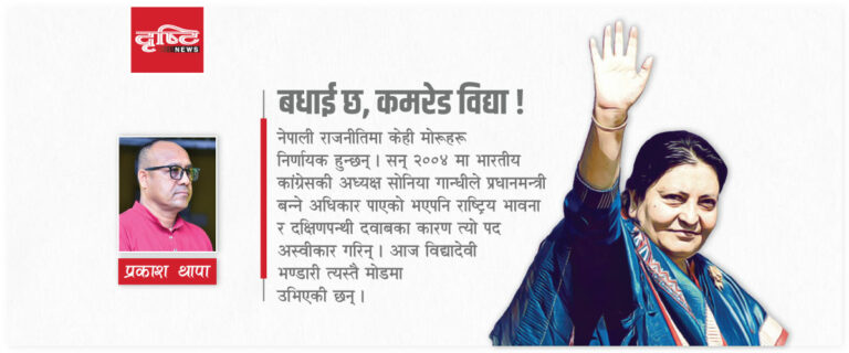नेपाली राजनीतिमा केही मोडहरू निर्णायक हुन्छन् । सन् २००४ मा भारतीय कांग्रेसकी अध्यक्ष सोनिया गान्धीले प्रधानमन्त्री बन्ने अधिकार पाएको भए पनि राष्ट्रिय भावना र दक्षिणपन्थी दवाबका कारण त्यो पद अस्वीकार गरिन् । आज विद्यादेवी भण्डारी त्यस्तै मोडमा उभिएकी छन् । न सत्तामा, न प्रतिपक्षमा, न सक्रिय राजनीतिमा ।