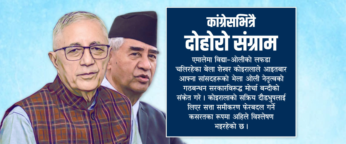 एमालेमा विद्या–ओलीको लफडा चलिरहेका बेला कोइरालाले आइतबार आफ्ना सांसदहरूको भेला ओली नेतृत्वको गठबन्धन सरकारविरुद्ध मोर्चा बन्दीको संकेत गरेका हुन् । कोइरालाको सक्रिय दौडधुपलाई लिएर सत्ता समीकरण फेरबदल गर्ने कसरतका रूपमा अहिले विश्लेषण भइरहेको छ ।