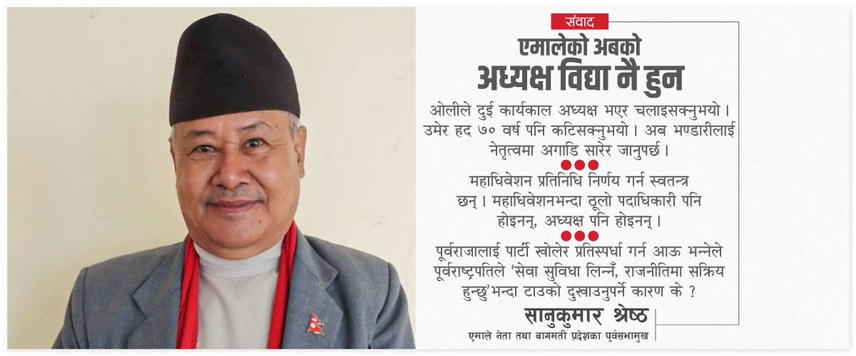 उमेर हद ७० वर्ष र लिडरसिपको हकमा दुई कार्यकालको व्यवस्था गरिएको हो । अहिले फेरि एकजना व्यक्तिलाई हेरेर उमेर हद र कार्यकालको सीमा हटाउने कुरा कुनै पनि हिसाबले जायज हुँदैन । यसले पार्टीको लोकतान्त्रिकरणलाई अवरुद्ध पार्छ । यो जबज विपरीत हुन्छ । युवा भन्ने नेताहरूले ७० वर्षे उमेरहदको विषयमा कुरा उठाउनुपर्नेमा उल्टै उमेर हद हटाउने कुरा गरेको देख्दा उदेक लाग्छ । मदन भण्डारीले युवा अवस्थामै पार्टी हाक्नुभयो । विष्णु पौडेल, शंकर पोखरेलहरूले सोच्नुपर्ने कुरा हो । एमालेमा नेतृत्व लिन दोस्रो पुस्ताका कोही पनि तयार नभएपछि पूर्वराष्ट्रपति भण्डारी ‘मेरो आवश्यकता छ’ भनेर आउनुभएको हो ।