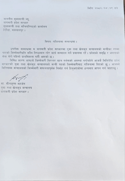 राजीनामा दिनेमा संस्कृति तथा पर्यटनमन्त्री विमल ठकुरी, सहकारी तथा गरिबी निवारण मन्त्री मदुकुमार श्रेष्ठ, युवा तथा खेलकुद मन्त्री मीनकृष्ण महर्जन र आन्तरिक मामिला तथा कानुन मन्त्री सुरजचन्द्र लामिछाने छन् ।
