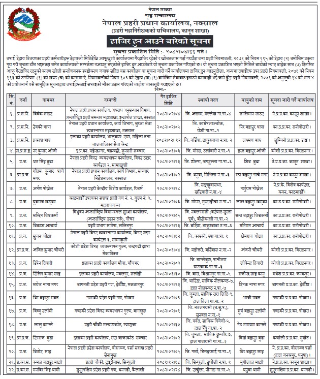 प्रहरी प्रधान कार्यालयको कानुन शाखाले आइतबार एक सार्वजनिक सूचना जारी गर्दै २२ जना प्रहरी लामो समयदेखि गैरहाजिर रहेको भन्दै उनीहरूलाई सम्पर्कमा आउन ७ दिनको समय दिएको छ ।