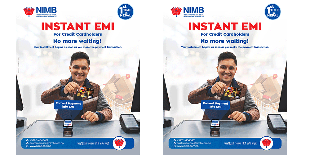 अबदेखि एनआईएमबी क्रेडिट कार्ड प्रयोगकर्ताले कुनैपनि व्यापारिक स्थानमा ‘‘NIMB POS Machine’ मार्फत भुक्तानी गर्दा सोही क्षणदेखि किस्ताबन्दी (EMI) सुविधा प्रयोग गर्न सक्नेछन् । यो सुविधा ग्राहकवर्गहरूले ठूलो खर्चलाई सानो मासिक किस्तामा विभाजन गरेर सजिलै तिर्न सक्ने प्रणाली हो, जुन छुट्टै आवेदन प्रक्रिया वा कुर्नुपर्ने झन्झटबिनै तुरुन्तै उपलब्ध हुनेछ ।