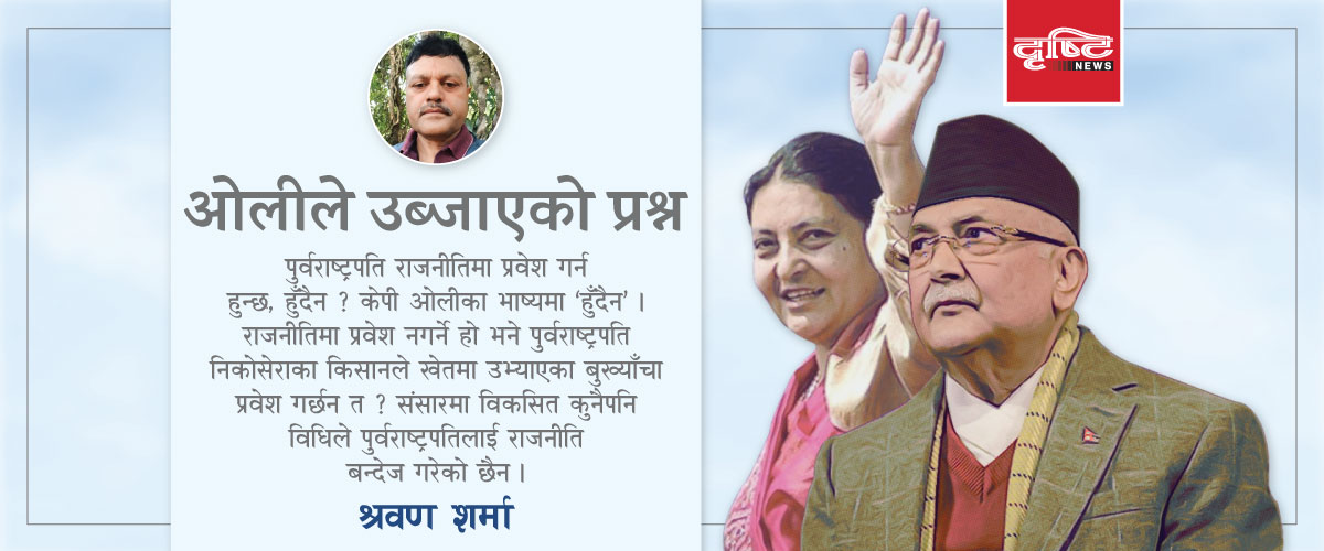 पुर्वराष्ट्रपति राजनीतिमा प्रवेश गर्न हुन्छ, हुँदैन ? ओलीका भाष्यमा हुँदै हुँदैन । राजनीतिमा पुर्वराष्ट्रपति प्रवेश नगर्ने हो भने के निकोसेराका किसानले खेतमा उभ्याएका बुख्याँचा प्रवेश गर्छन त ? पुर्वराष्ट्रपतिलाई आफ्नो जन्मस्थान रहेको पालिकाको मेयर बन्ने अधिकार यो संविधानले दिएको छ कि छैन ? संसारमा विकसित कुनैपनि विधिले पुर्वराष्ट्रपतिहरुका लागि राजनीति बन्धित गरेको छ ? छैन ।