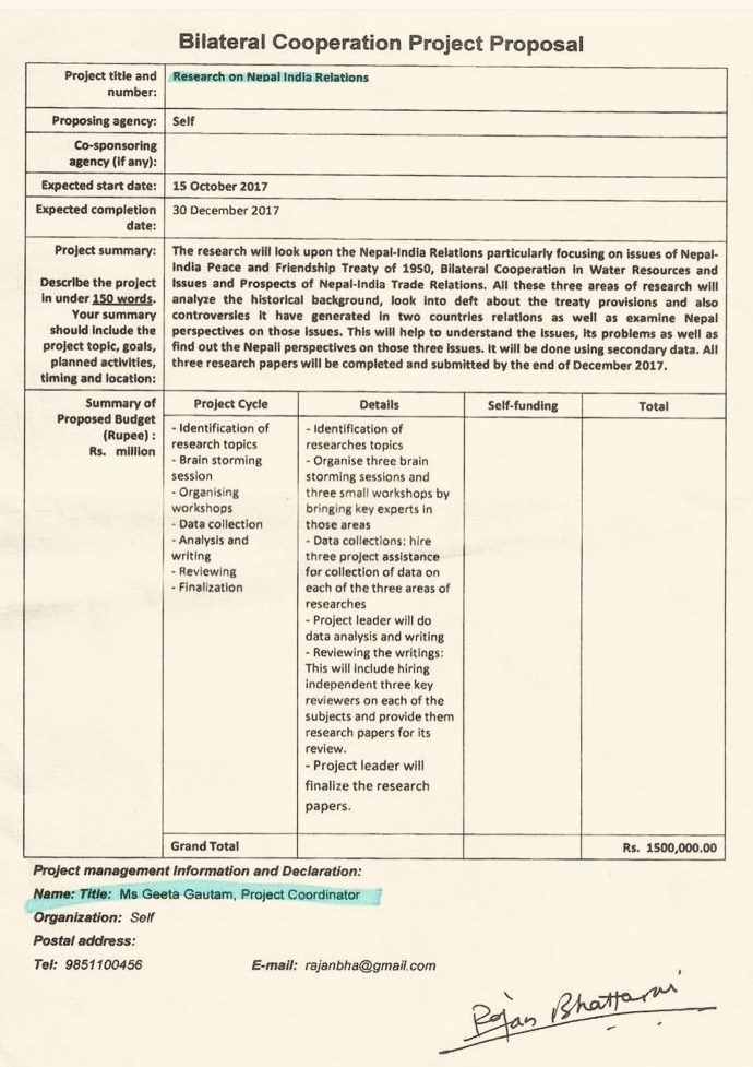 १५ लाख बुझेको उक्त प्रोजेकट १५ अक्टोबर सन् २०१७ देखि ३० डिसेम्बर २०१७ सम्मको रहेको र नेपाल भारतबीचको सन् १९५० को सन्धिसँग सम्बन्धित विषयबारे रिसर्च गर्ने भनिएको छ । प्रोजेक्ट संयोजकमा भट्टराईले गीता गौतमको नाम राखेका छन् । रकम आफ्नै हस्ताक्षरमा बुझेका छन् । फ्रान्स केन्द्रित खोजमुलक पत्रकारिता गर्दै आएका रोल्यान्ड ज्याकर्डले नेपालः द न्यु चाइनाज स्याटलाइट स्टेर शिर्षकमा एक्स्क्लुसिभ भन्दै सार्वजनिक गरेको समाचारमा नेपालमा चीनले विस्तारवादी नीति अनुसार यस्ता कार्यहरु गर्दै आएको आरोप समेत लगाएको छ । चीनको राज्य नियन्त्रित कम्पनिहरुले नेपालमा धमाधम ठेक्का पाइरेको विषय पनि उल्लेख गरेका छन् ।