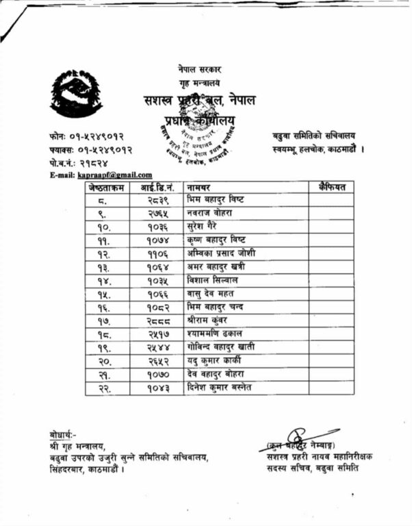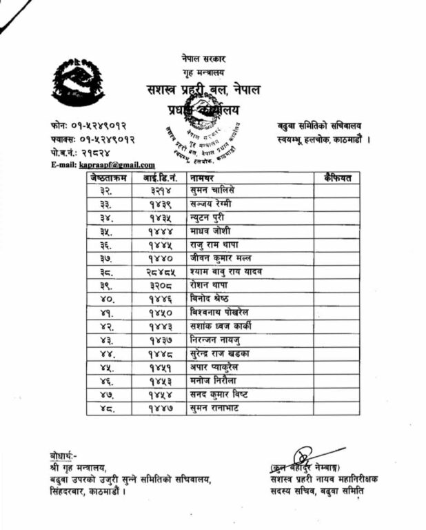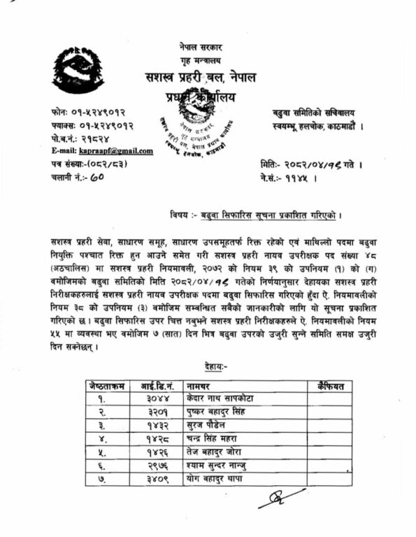 बढुवा समितिका अनुसार सशस्त्र प्रहरी वरिष्ठ उपरिक्षक (एसएसपी)मा ६, उपरीक्षक (एसपी)मा २२, प्राविधिक एसपीमा एक र नायव उपरीक्षक डीएसपीमा ४८ जनालाई बढुवा सिफारिस गरिएको छ ।