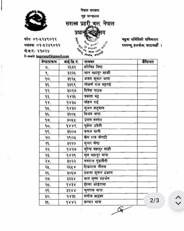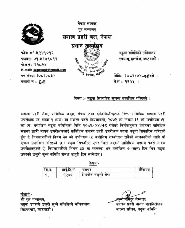 काठमाडाौं । सशस्त्र प्रहरी बल नेपालका ७७ जना विभिन्न पदका अधिकृतहरूको बढुवा सिफारिस भएको छ । सोमबार बसेको बढुवा समितिको बैठकले लामो समयदेखि रिक्त रहेका एसएसपी, एसपी र डिएसपी पदमा बढुवाका लागि सिफारिस गरेको हो ।