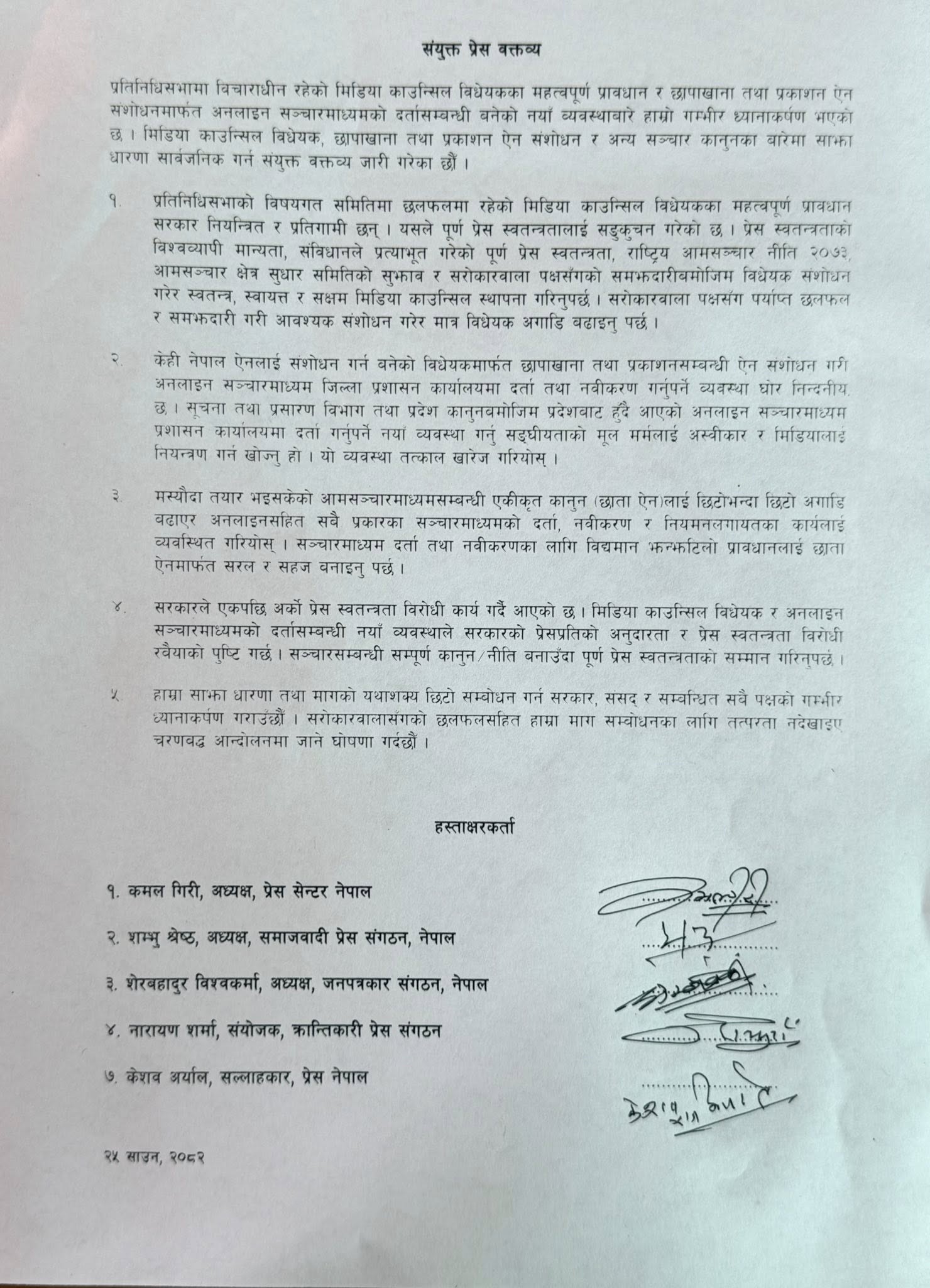 मिडिया काउन्सिल विधेयक, छापाखाना तथा प्रकाशन ऐन संशोधन र अन्य सञ्चार कानुनका बारेमा साझा धारणा सार्वजनिक गर्न संयुक्त वक्तव्य जारी गरेका छन् । प्रेस सेन्टर नेपालका अध्यक्ष कमल गिरी, समाजवादी प्रेस संगठन, नेपालका अध्यक्ष शम्भु श्रेष्ठ, जनपत्रकार संगठन, नेपालका अध्यक्ष शेरबहादुर विश्वकर्मा, क्रान्तिकारी प्रेस संगठनका संयोजक नारायण शर्मा र प्रेस नेपालका सल्लाहकार केशव अर्यालले विज्ञप्तिमा हस्ताक्षर गरेका छन् ।