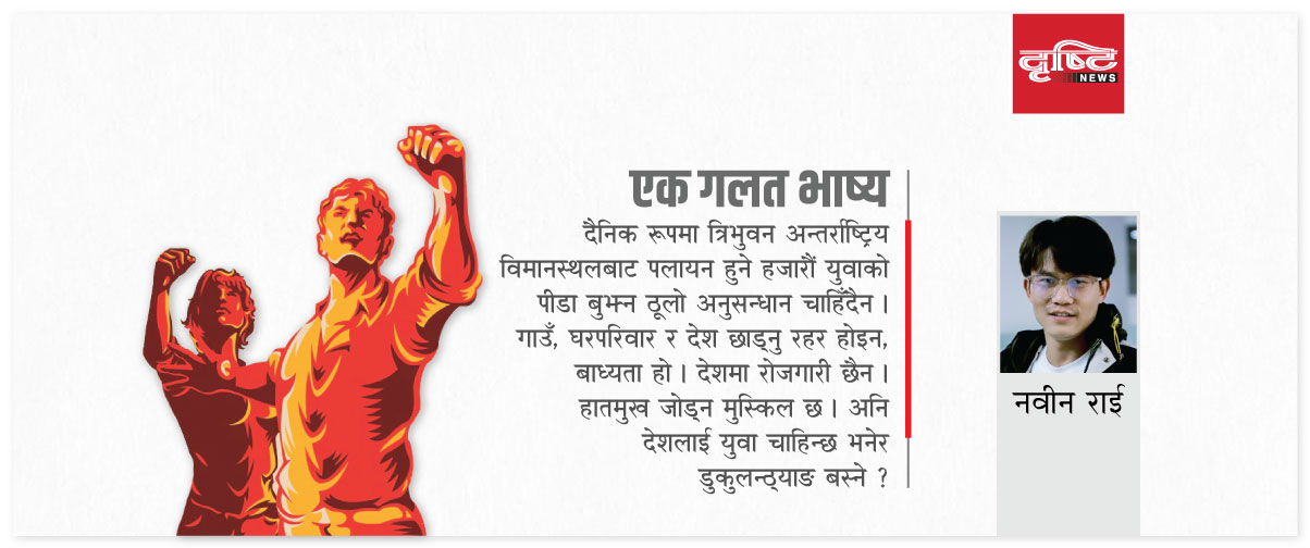 दैनिक रूपमा त्रिभुवन अन्तर्राष्ट्रिय विमानस्थलबाट पलायन हुने हजारौं युवाको पीडा बुझ्न ठूलो अनुसन्धान चाहिँदैन । गाउँ, घरपरिवार र देश छाड्नु रहर होइन, बाध्यता हो । देशमा रोजगारी छैन । हातमुख जोड्न मुस्किल छ । अनि देशलाई युवा चाहिन्छ भनेर डुकुलन्ठ्याङ बस्ने ?
