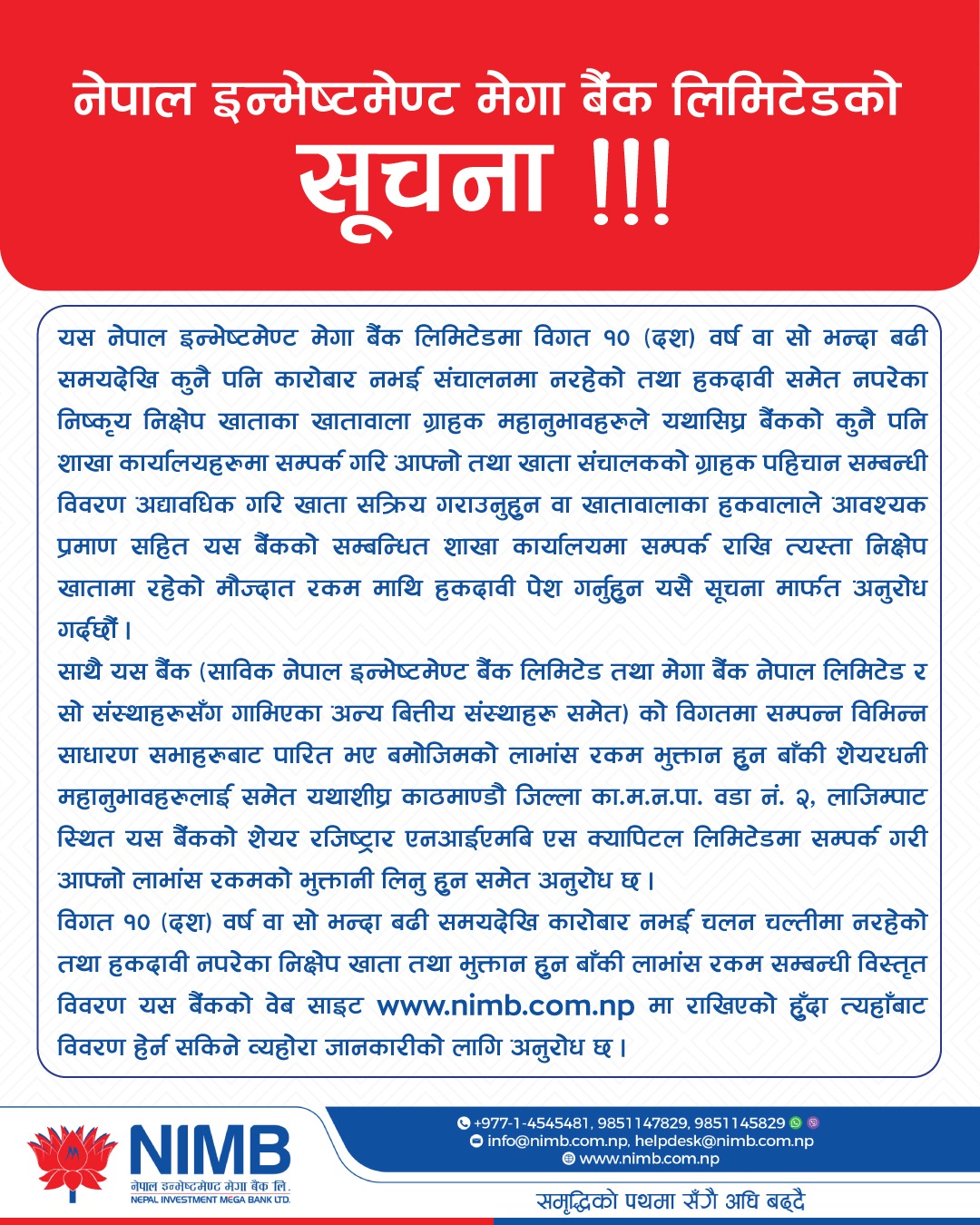 बैंकले एक सूचना जारी गर्दै १० वर्ष वा सोभन्दा बढी समयदेखि निष्क्रिय रहेका खाताहरूमा मौज्दात रकम दाबी गर्न सम्बन्धित खातावालाहरूलाई अद्यावधिक गरी खाता सक्रिय गराउन अनुरोध गरेको हो । बैंकले निष्क्रिय खातावालाहरूलाई आफ्नो नजिकको शाखामा सम्पर्क गरी आवश्यक कागजातसहित दाबी पेश गर्न अनुरोध गरेको छ ।