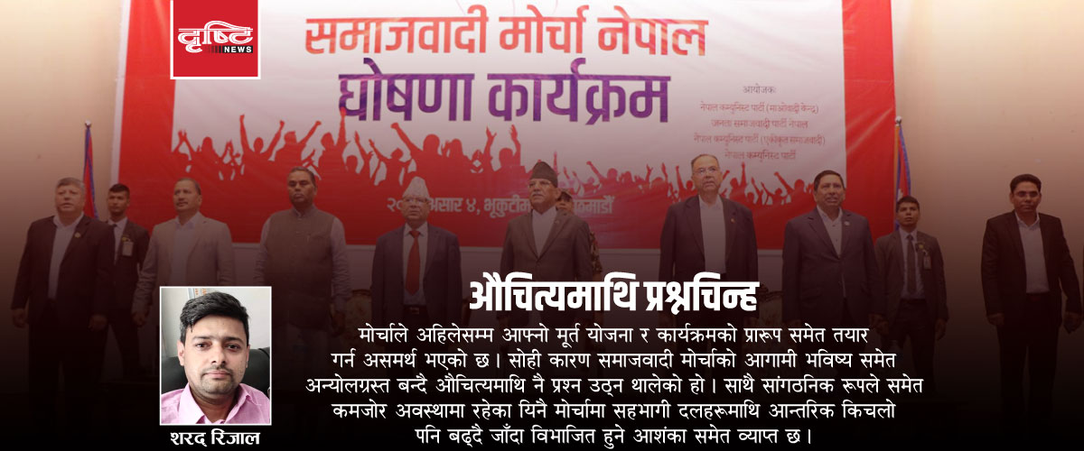नत्र आफ्नै दल बलियो बनाउन नसकेर निरीह बनेका नेताहरूले मोर्चा मजबुत बनाउने प्रयत्न आफैँमा विरोधाभासपूर्ण कार्य हो । संसदीय व्यवस्थामा सांगठनिक रूपमा बलियो दल भए चुनावमा अरू कसैको बैसाखीको जरुरत नै पर्दैन । तर, समाजवादी मोर्चामा आबद्ध दलका शीर्ष नेताहरू भने आफ्नो दलको आन्तरिक संकट टार्ने बाह्य प्रयत्नस्वरुप मोर्चालाई उपयोग गर्न खोजेका छन् ।