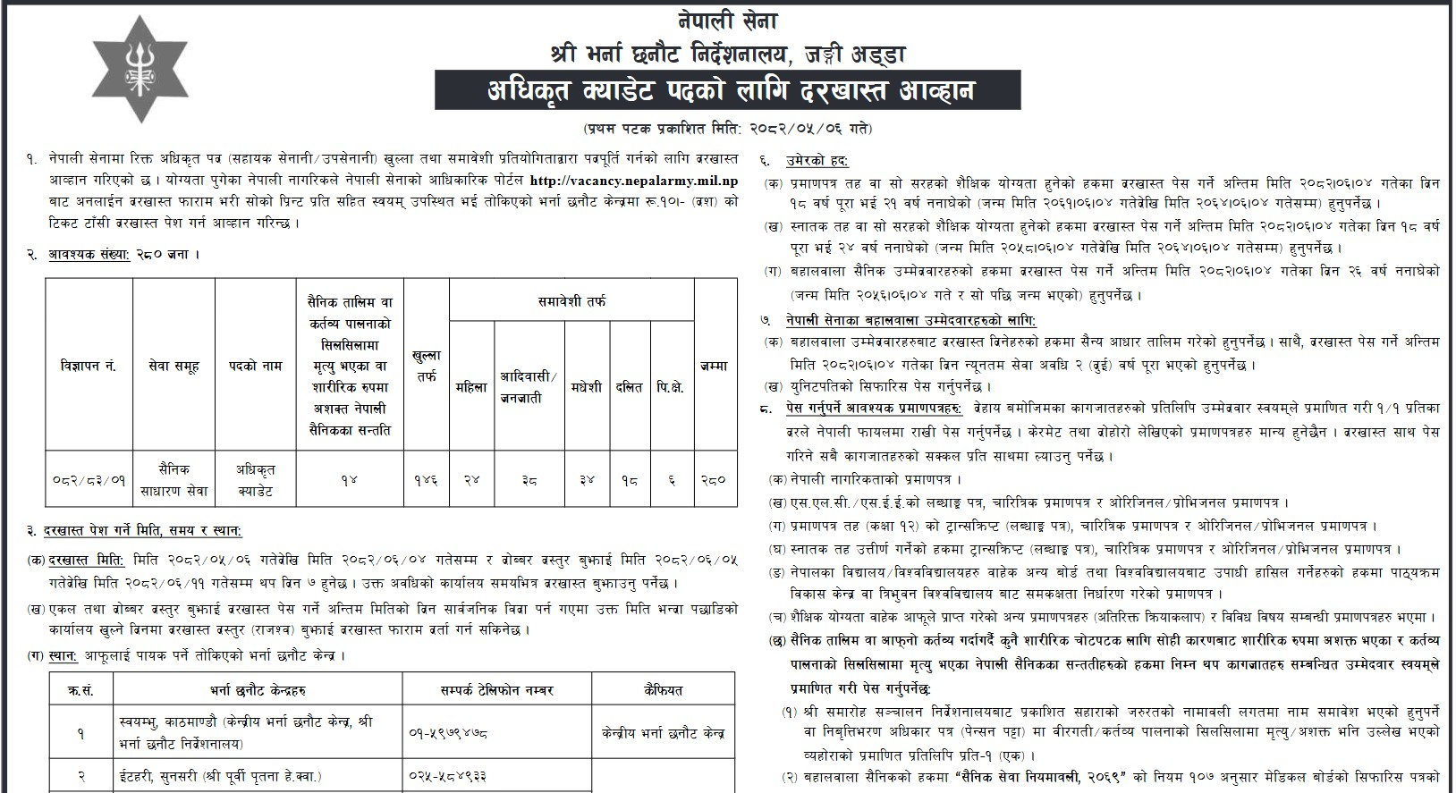 सैनिक साधारण सेवा समूहतर्फ रिक्त रहेको उक्त पदमा समावेशी आधारमा नयाँ नियुक्ति गरिने सेनाले जनाएको छ ।