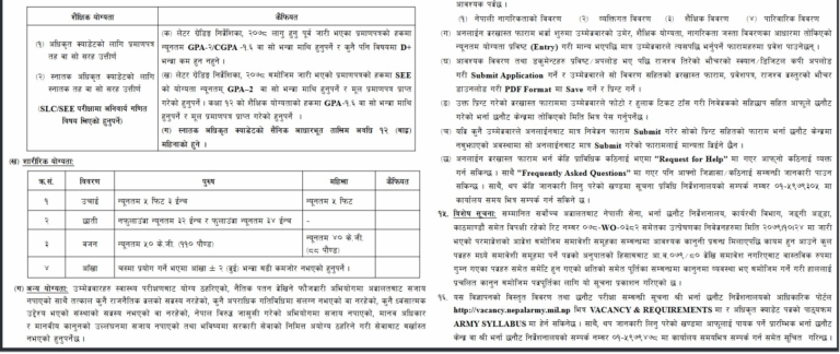 योग्यता पुगेका इच्छुक नेपाली नागरिकले आजदेखि आगामी असोज ४ गतेसम्म आवेदन दिन सक्नेछन् । दोब्बर दस्तुर बुझाएर असोज ११ गतेसम्म आवेदन दिन सकिने सेनाले जनाएको छ ।