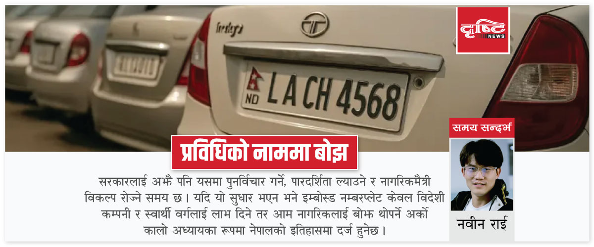 नेपालका शासकहरू विगतदेखि नै जनतालाई सास्ती र त्रासको छायामा राखेर शासन गर्न अभ्यस्त छन् । नागरिकलाई सहजता, सेवा र सुविधा दिने हैसियतमा राज्यको उपस्थितिभन्दा बोझ, कर र नियन्त्रणकै माध्यममा शासन गर्ने परिपाटी स्थायी अभ्यासझैँ बनिसकेको छ । यही शृंखलाको निरन्तरता स्वरूप आज फेरि आम नागरिकमाथि अर्को असहज निर्णय लादिएको छ– ‘इम्बोस्ड नम्बर प्लेट’ प्रणाली ।